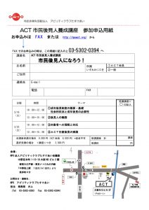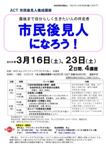 (終了しました)2019年3月 ACT市民後見人養成講座のお知らせ 2019 4/15 お知らせ 公開講座 成年後見 ACT市民後見人養成講座を行います。 詳細はチラシをごらんください。 2018市民後見人養成講座チラシ(おもて)(クリックして拡大)2018市民後見人養成講座チラシ(うら)(クリックして拡大) お問い合わせ:NPO法人アビリティクラブたすけあい事務局 Tel 03-5302-0393 Fax 03-5302-0394 メール:tokyoact@maple.ocn.ne.jp お知らせ 公開講座 成年後見 URLをコピーしました! URLをコピーしました!
